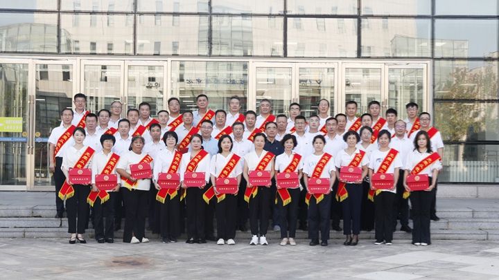 校領(lǐng)導(dǎo)、合作企業(yè)代表與“從教30年以上”教師、遼寧省最美教師合影留念