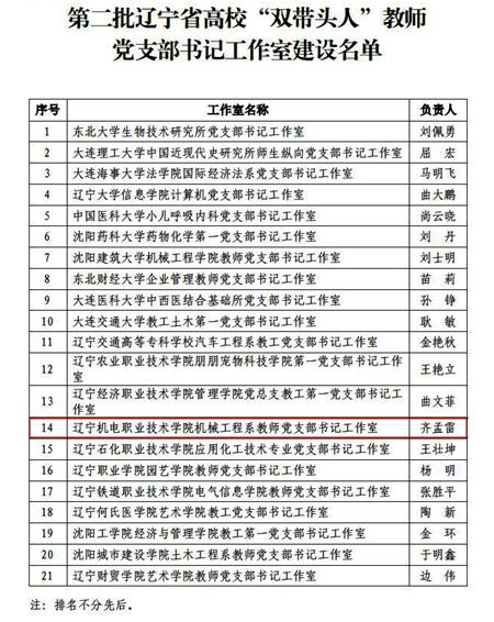 為推進高校教師黨支部書記“雙帶頭人”培育工程,按照教育部的統(tǒng)一部署,2020年年末,中共遼寧省委教育工委組織開展了第二批高?!半p帶頭人”教師黨支部書記工作室遴選工作。經(jīng)高校申報、資格審查、專家評審、結果公示,遴選產(chǎn)生了21個第二批遼寧省高校“雙帶頭人”教師黨支部書記工作室。2021年5月8日,省委教育工委正式公布了第二批遼寧省高?!半p帶頭人”教師黨支部書記工作室建設名單,我院機械工程系教師黨支部成功入選。