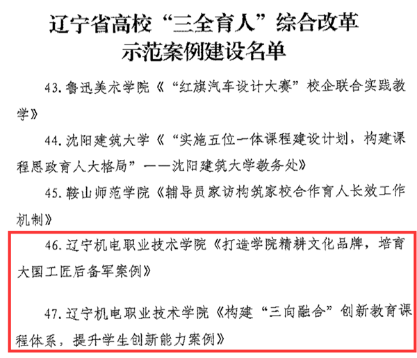 1月18日,遼寧省委教育工委、遼寧省教育廳公布了全省高?!叭恕本C合改革示范項(xiàng)目建設(shè)名單。我院《打造學(xué)院精耕文化品牌,培育大國工匠后備軍案例》和《構(gòu)建“三向融合”創(chuàng)新教育課程體系,提升學(xué)生創(chuàng)新能力案例》兩個(gè)案例入選遼寧省高?!叭恕本C合改革示范案例建設(shè)名單。