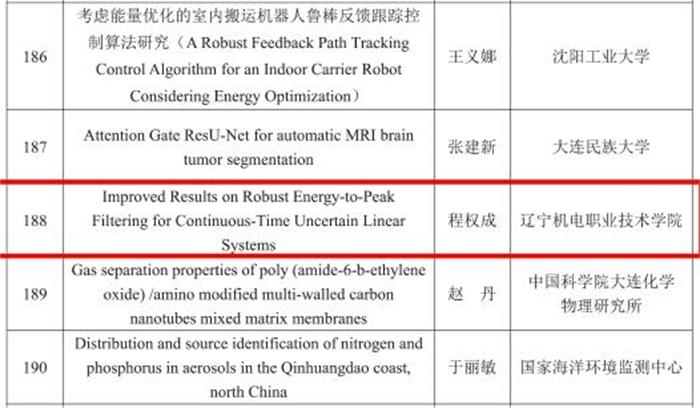 我院申報的自然科學學術成果名稱為“Improved Results on Robust Energy-to-Peak Filtering for Continuous-Time Uncertain Linear Systems”,該成果為2017年院級科研項目(2017010)資助成果,于2019年發(fā)表在信號處理領域知名國際期刊Circuits, Systems, and Signal Processing,該期刊為Springer旗下經(jīng)典SCI檢索期刊,同時被EI檢索,主要刊登電路系統(tǒng)、信號處理方面具有較高理論創(chuàng)新的成果,JCR Q3分區(qū)期刊,中科院3區(qū)期刊,影響因子為2.311,該成果在Web of Science核心集數(shù)據(jù)庫(SCI數(shù)據(jù)庫)中已被他引6次,獲評丹東市科學技術協(xié)會2020年度自然科學優(yōu)秀論文一等獎。