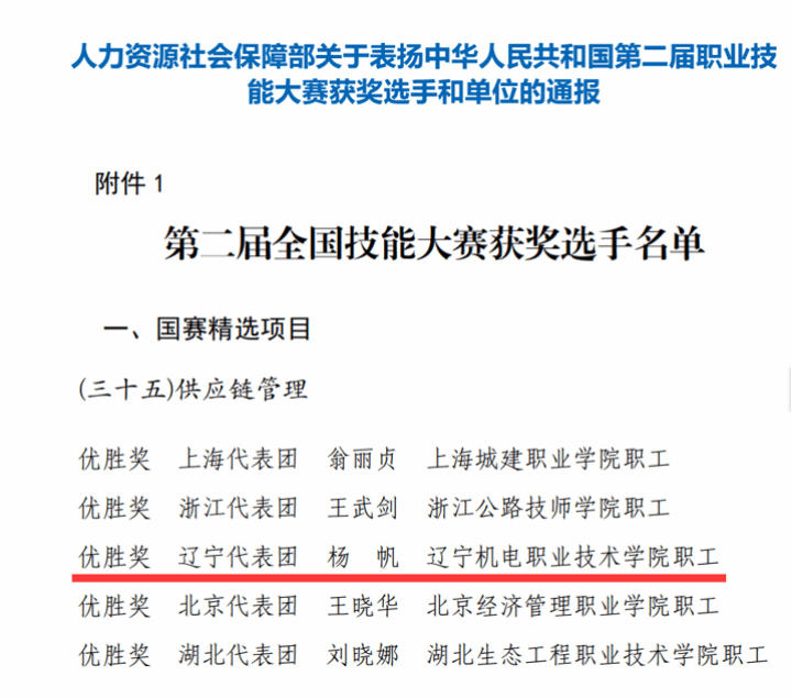近日,人力資源社會(huì)保障部發(fā)布《關(guān)于表?yè)P(yáng)中華人民共和國(guó)第二屆職業(yè)技能大賽獲獎(jiǎng)選手和單位的通報(bào)》,我校教師楊帆在教練趙東明的指導(dǎo)下榮獲第二屆全國(guó)職業(yè)技能大賽“供應(yīng)鏈管理”賽項(xiàng)優(yōu)勝獎(jiǎng)。