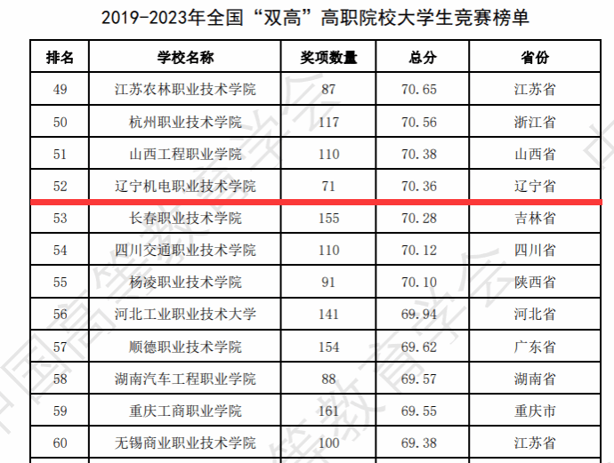 中國高等教育學(xué)會是我國高等教育領(lǐng)域成立時間最長、規(guī)模最大、影響力最廣的全國性學(xué)術(shù)社團(tuán)組織。本《分析報告》將全國1254所高職院校(含職業(yè)大學(xué))納入其中,學(xué)會參照2023年競賽清單,形成高職院校大學(xué)生競賽榜單11個,我校獲“2019-2023年東北地區(qū)高職院校大學(xué)生競賽榜單”第一名,并在全國197所獲批“雙高計劃”建設(shè)單位中,位居“2019-2023年‘雙高’高職院校大學(xué)生競賽榜單”第52名。